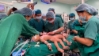 The first surgical cut is done at 9:51 a.m. Tran Van Duong, a doctor from the Department of Orthopedics and Trauma-Surgery of Cho Ray Hospital, heading the plastic surgery team, cuts open the belly to separate the two babies, with the General Surgery team carefully determining the separation of intestines.