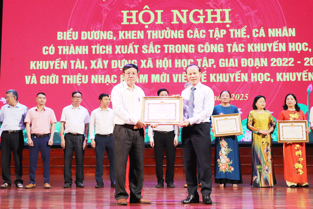 Đồng chí Nghiêm Xuân Hưởng trao Bằng khen của Chủ tịch UBND tỉnh cho các cá nhân có thành tích xuất sắc trong công tác khuyến học, khuyến tài giai đoạn 2022-2025. |