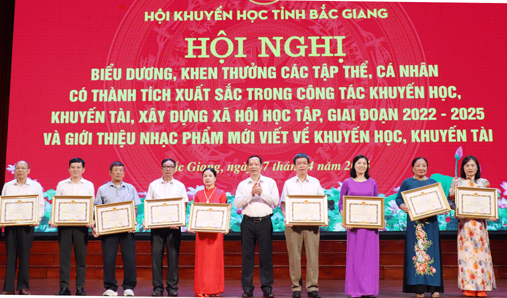 BẮC GIANG - Ngày 27/4, Hội Khuyến tỉnh Bắc Giang tổ chức hội nghị biểu dương, khen thưởng các tập thể, cá nhân có thành tích xuất sắc trong công tác khuyến học, khuyến tài, xây dựng xã hội học tập giai đoạn 2022-2025 và giới thiệu nhạc phẩm mới viết về khuyến học, khuyến tài tỉnh Bắc Giang.