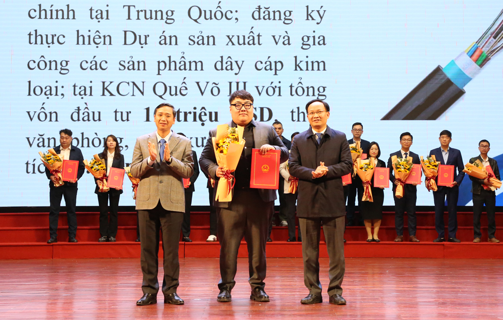 On behalf of provincial leaders, Nguyen Hong Thai welcomed investors receiving approvals and certificates at the event, praising their confidence and commitment to investing and expanding operations in Bac Ninh.