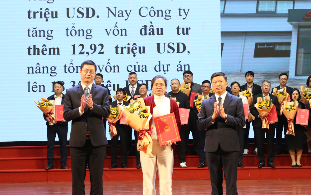 Chairman of the provincial People’s Council Nguyen Viet Oanh and Vice Chairman of the provincial People’s Committee Pham Van Thinh award investment registration certificates to foreign direct investment enterprises operating in the province’s industrial parks. |