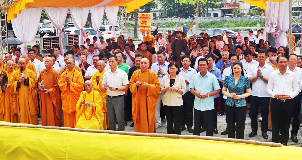 Chairman of the provincial People’s Committee Vuong Quoc Tuan and representative of Vietnam Buddhist Sangha perform the traditional wood-cutting ritual.