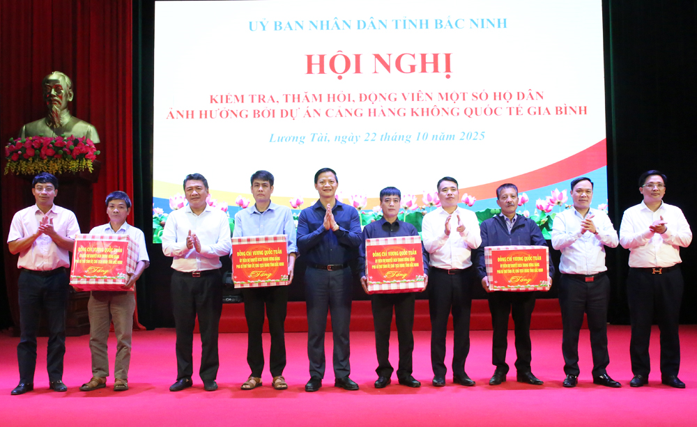 PPC Chairman Vuong Quoc Tuan presents gifts to several households in Luong Tai commune.