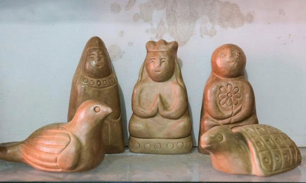 Statues are sculptured by hand, sundried and processed in many steps including polishing or painting to ensure glossy durability while keeping the rustic beauty of clay.