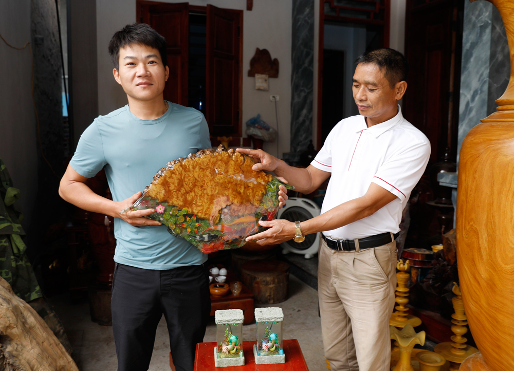 The “wood and resin art tea tray and display lamp” set by member Nguyen Van Duong (left) of Bai Oi Carpentry Cooperative in Bac Giang Ward, is recognized as an Outstanding Rural Industrial Product of 2025. |