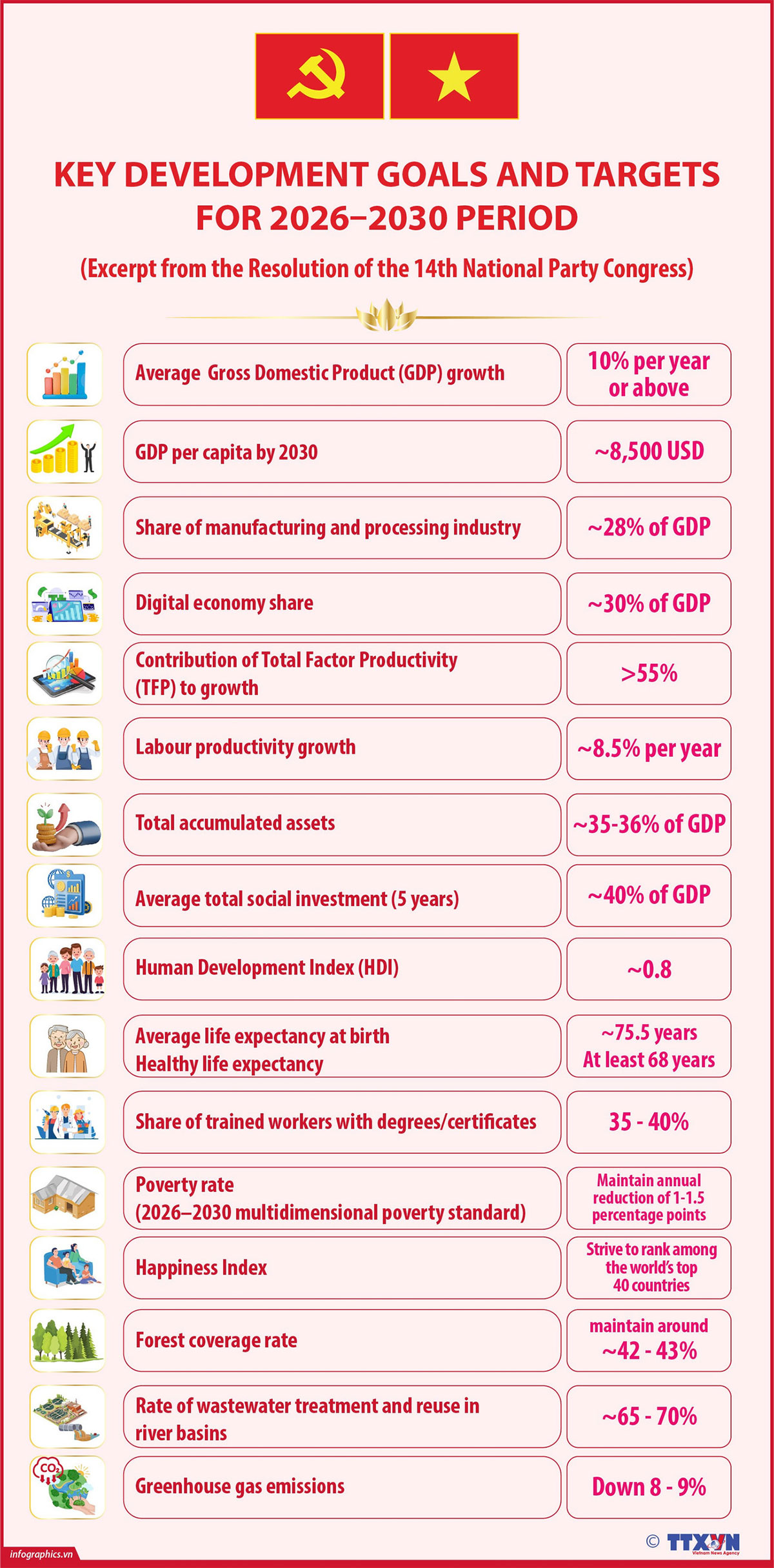 The 14th National Party Congress set the goal of achieving an average annual growth rate of gross domestic product (GDP) of 10% or more; and a GDP per capita of approximately 8,500 USD by 2030.