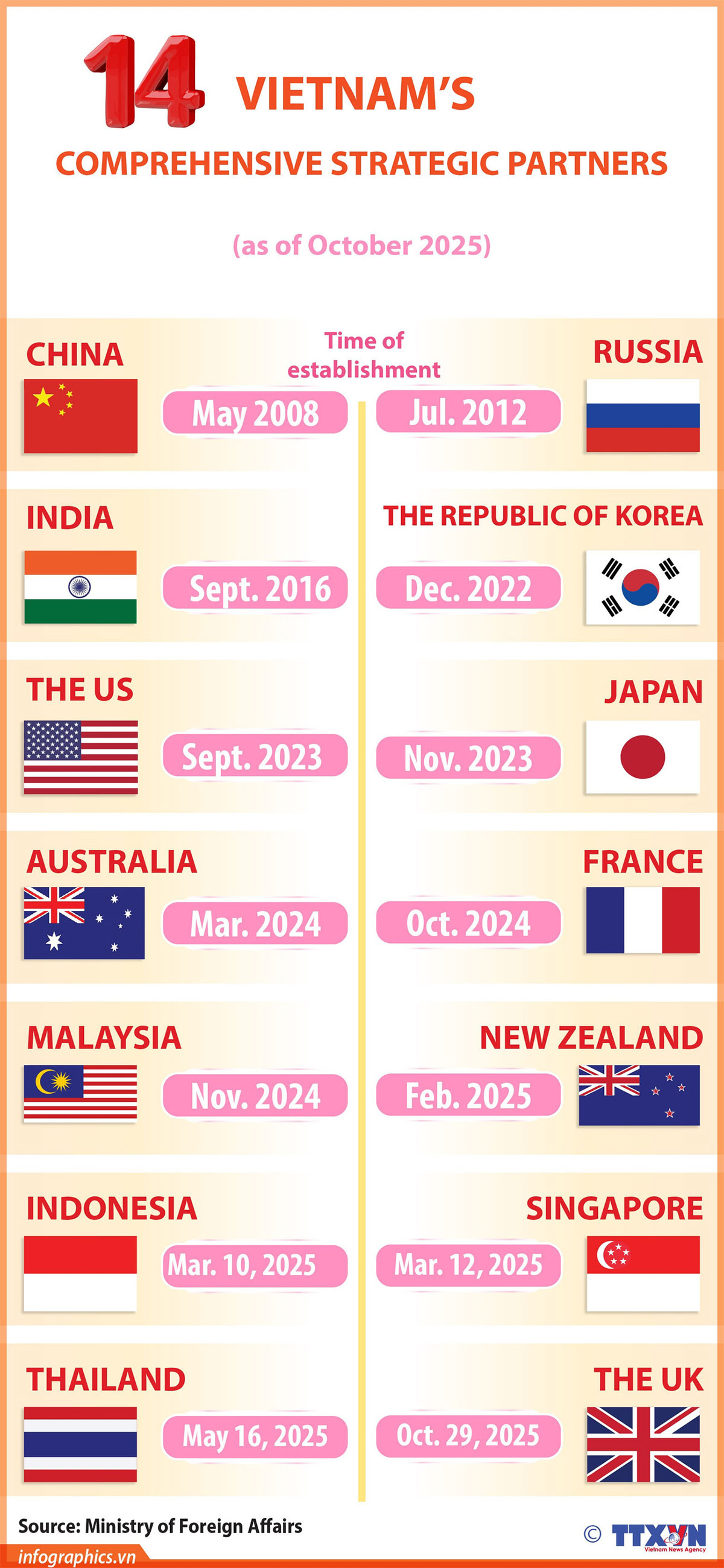 Vietnam and the United Kingdom have issued a joint declaration on the elevation of the Vietnam-UK to a Comprehensive Strategic Partnership. The announcement was made on October 29 (local time) following a welcome ceremony and talks between UK Prime Minister Keir Starmer and Party General Secretary To Lam as part of the latter's oficial visit to the UK. With this, Vietnam now has comprehensive strategic partnerships with 14 countries.