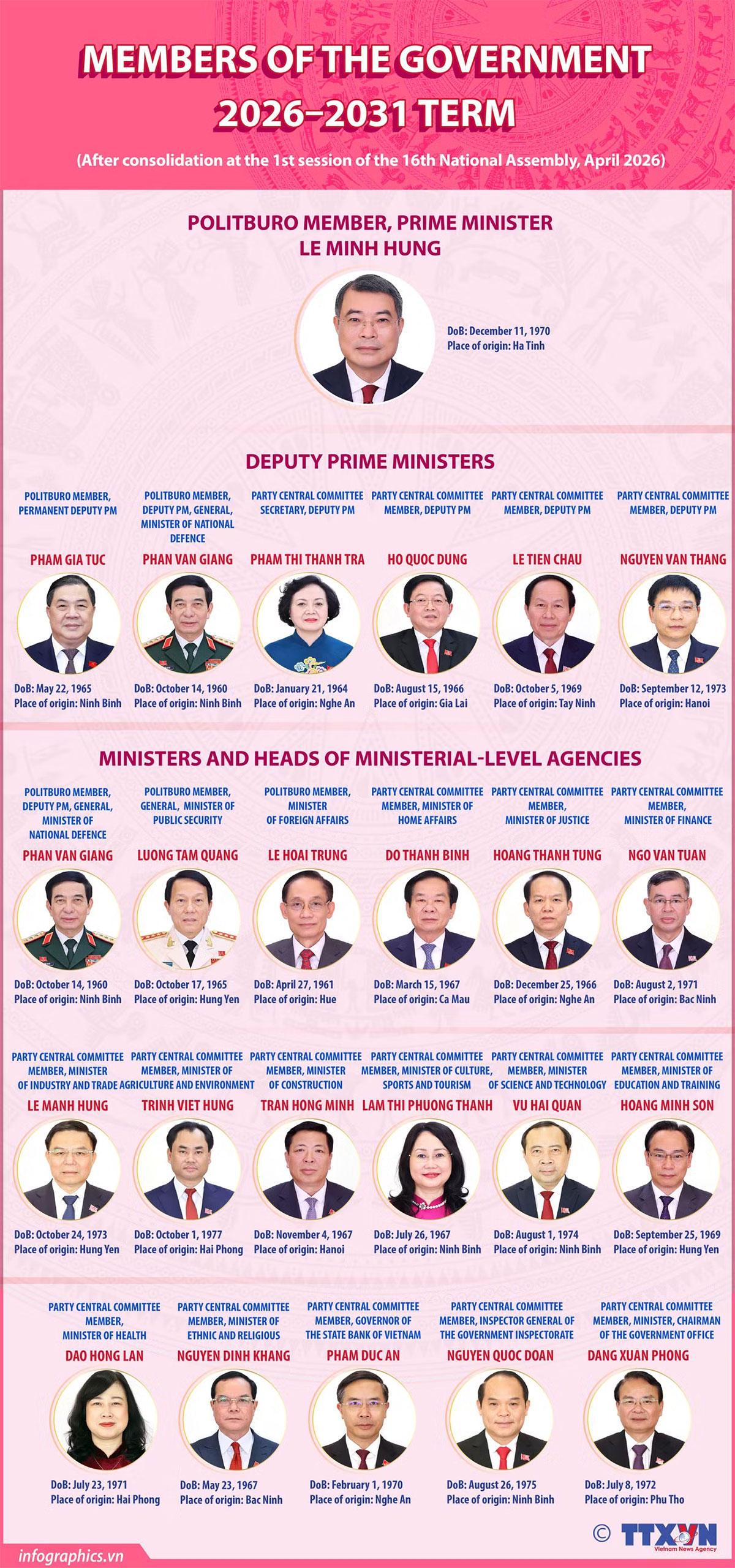 At its first session, the 16th National Assembly adopted a resolution electing Le Minh Hung, Politburo member, Secretary of the Party Central Committee and Chairman of the Party Central Committee’s Organisation Commission, as Prime Minister of Vietnam. The National Assembly voted to approve the resolutions on the appointments of Deputy Prime Ministers, Ministers, and other members of the Government for the 2026-2031 term.