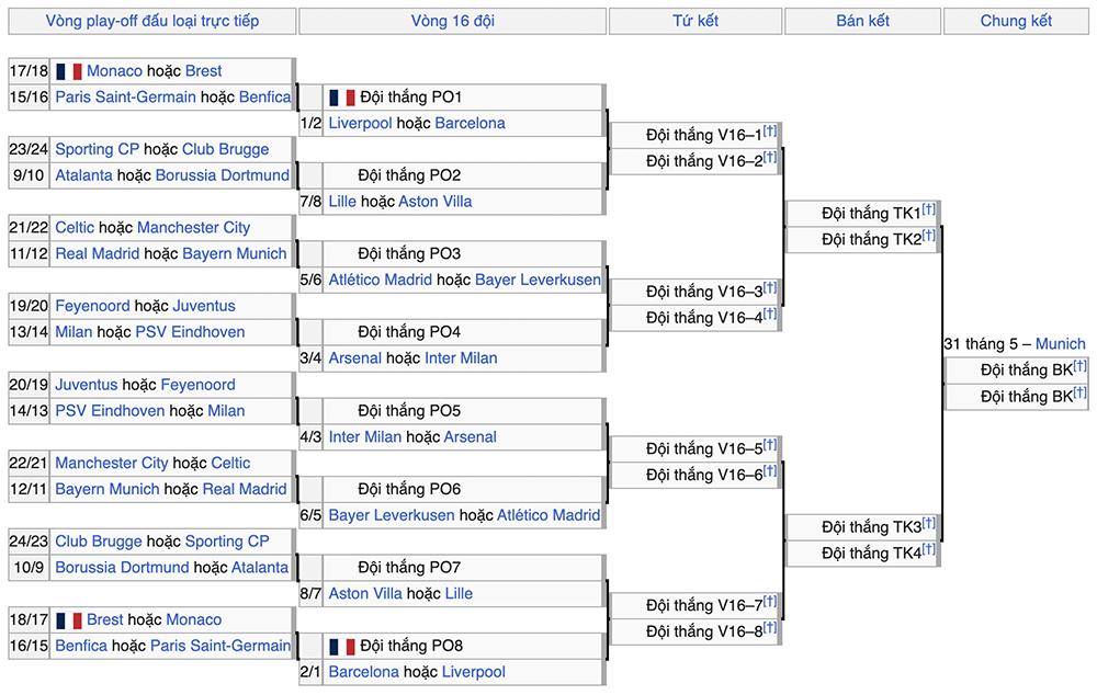 Kết quả phân nhánh vòng knock-out Champions League 2024-2025, trước lễ bốc thăm ngày 31/1/2025. |