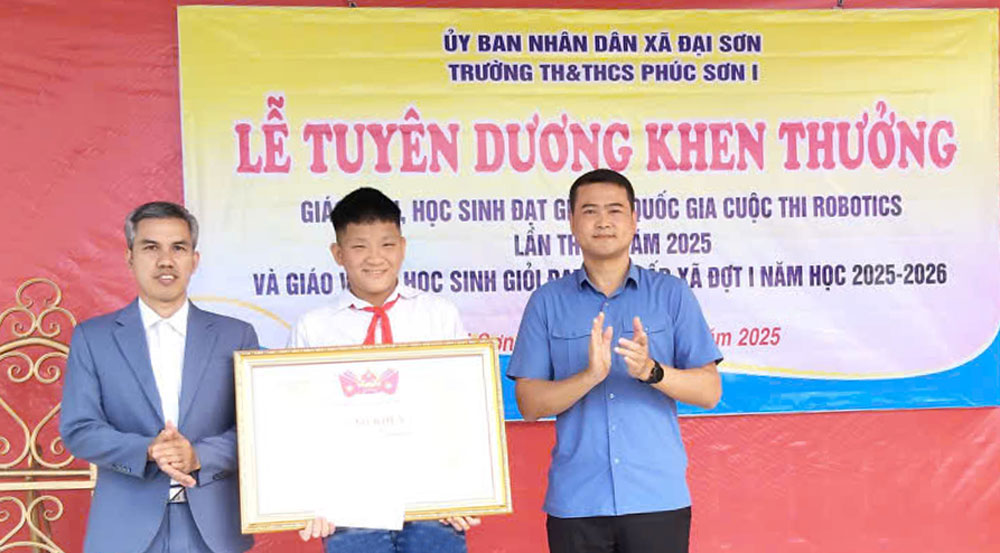 Đồng chí Hoàng Văn Quân, Bí thư Đảng ủy xã Đại Sơn trao thưởng cho em Nguyễn Nhật Thiên và giáo viên hướng dẫn. |