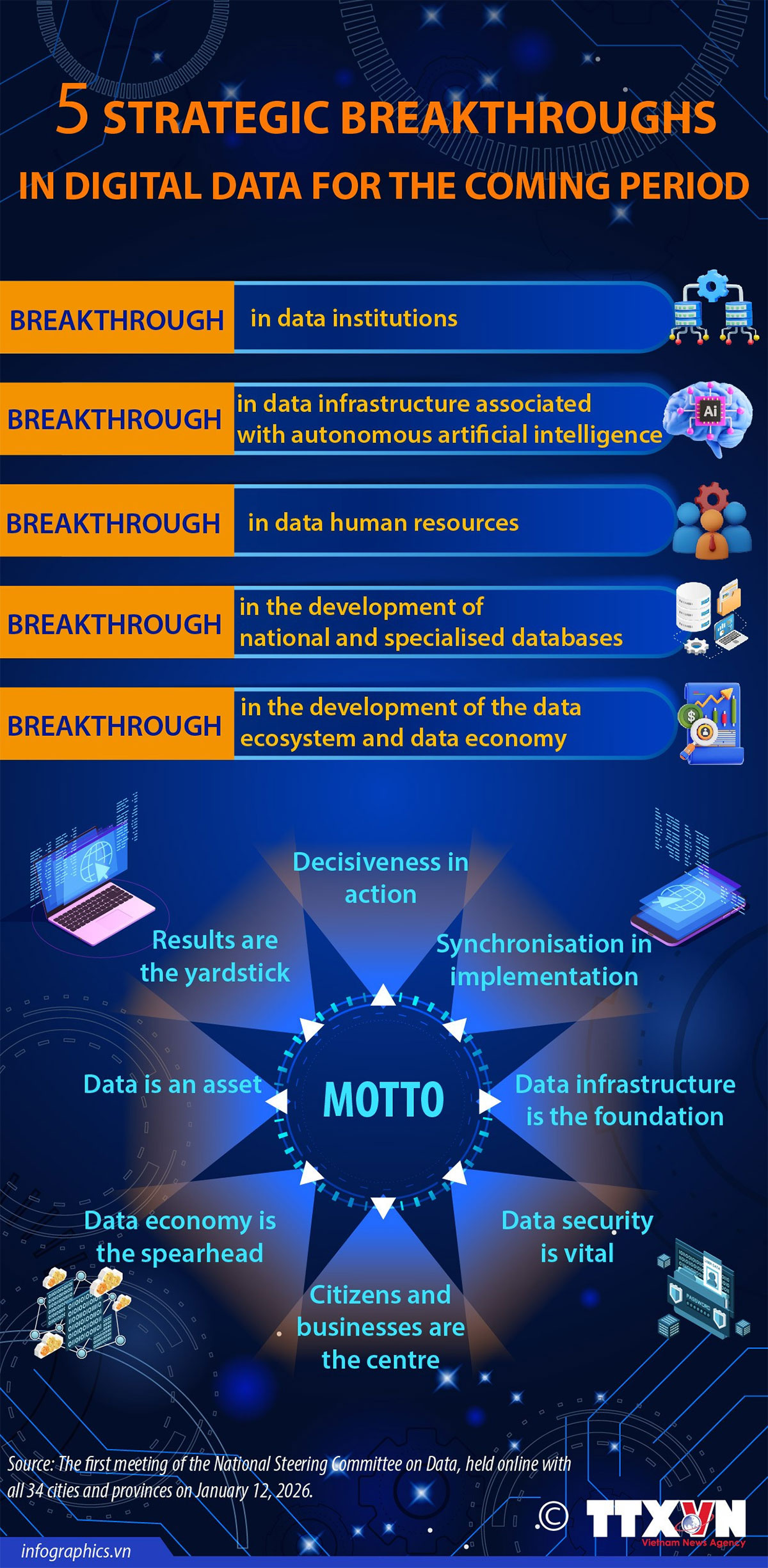 In the time ahead, five strategic breakthroughs must be implemented in digital data, guided by the principles of decisive action, results as the ultimate measure, and synchronized implementation. This was the requirement set out by Prime Minister Pham Minh Chinh, Head of the National Steering Committee on Data, at the Committee’s first meeting, held online on January 12, with all 34 cities and provinces nationwide.