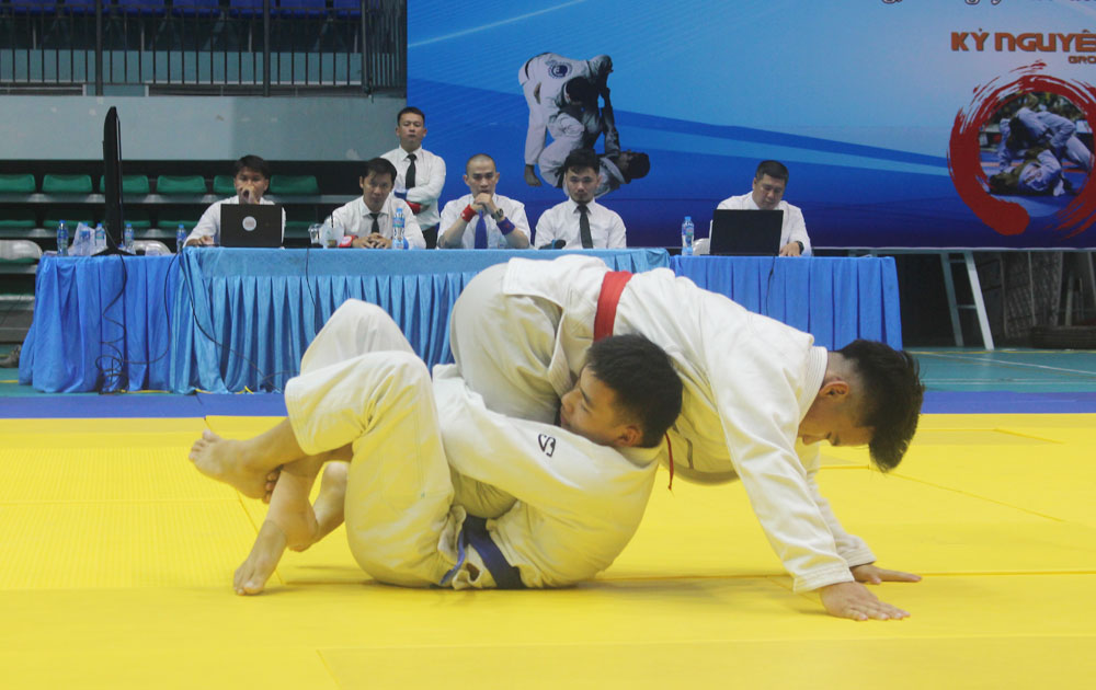 Trận đấu nội dung Newaza Gi, hạng cân 62kg giữa VĐV Hoàng Văn Toản (Bắc Giang, đai đỏ) và VĐV Dương Huy Cường (Thái Bình). |