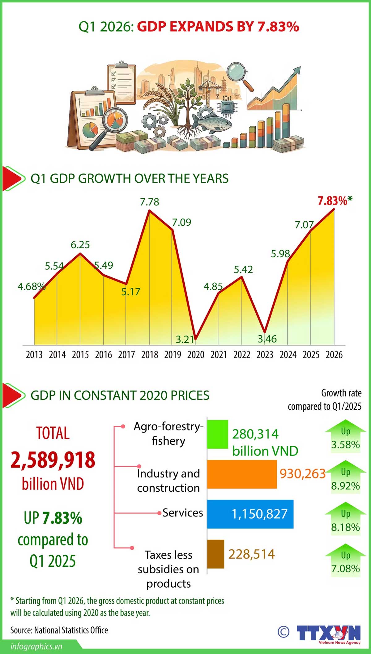 Vietnam's gross domestic product (GDP) expanded 7.83 percent in the first quarter of 2026, according to the National Statistics Office.