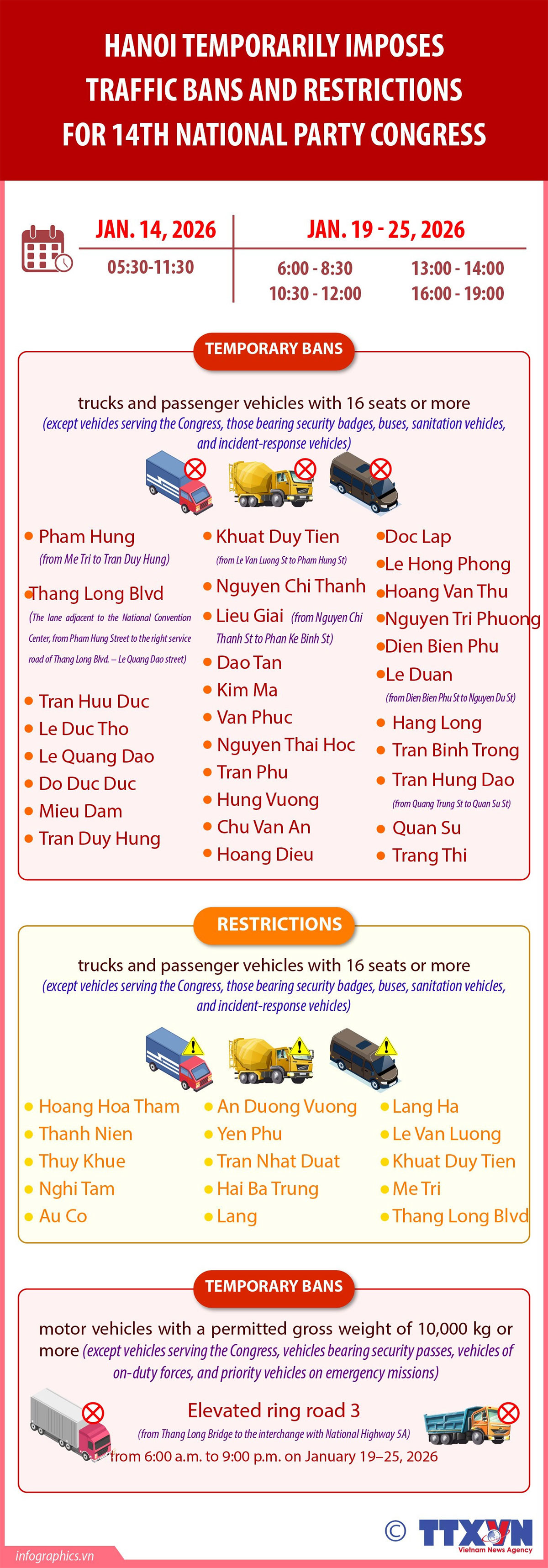 The Hanoi Police have announced temporary traffic bans and restrictions at specific times on January 14, 2026 (from 5:30 a.m. to 11:30 a.m.) and from January 19 to 25, 2026 (from 6:00 to 8:30 a.m.; 10:30 a.m. to 12:00 p.m.; 1:00 to 2:00 p.m.; and 4:00 to 7:00 p.m.) to ensure traffic safety and order during the 14th National Party Congress.
