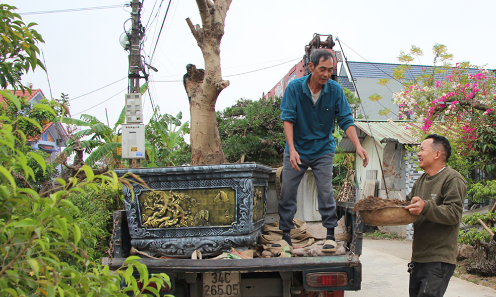 The household of Nguyen Duc San in Ngo Thon village relocates ornamental plants. |