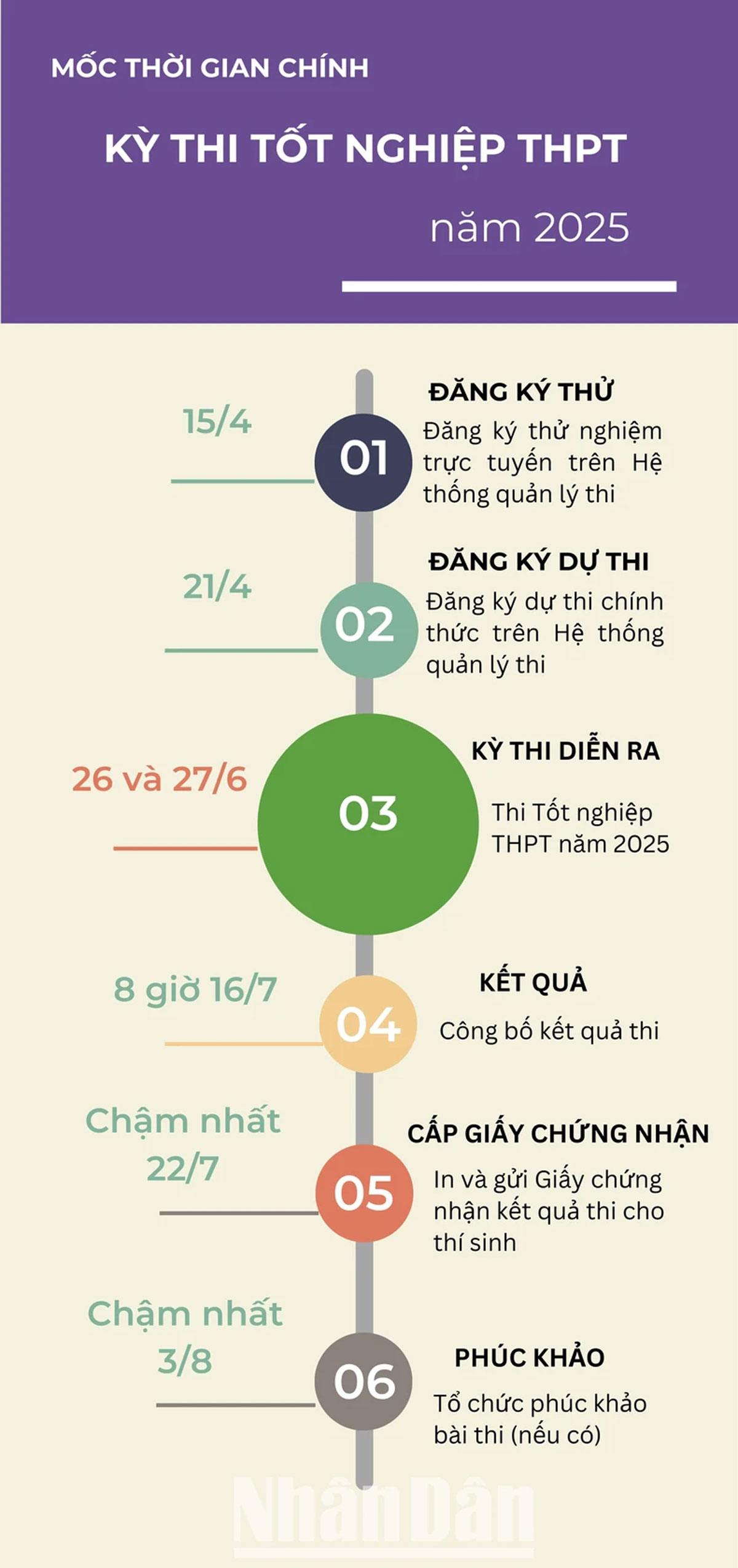 Kỳ thi tốt nghiệp Trung học Phổ thông năm 2025 chính thức diễn ra vào ngày 26 và 27/6. Để chuẩn bị cho kỳ thi, các thí sinh bắt đầu đăng ký tham dự theo hình thức trực tuyến trên hệ thống quản lý thi của Bộ Giáo dục và Đào tạo từ ngày 21/4. Thí sinh cần nắm rõ các mốc thời gian kỳ thi để có sự chuẩn bị tốt nhất.