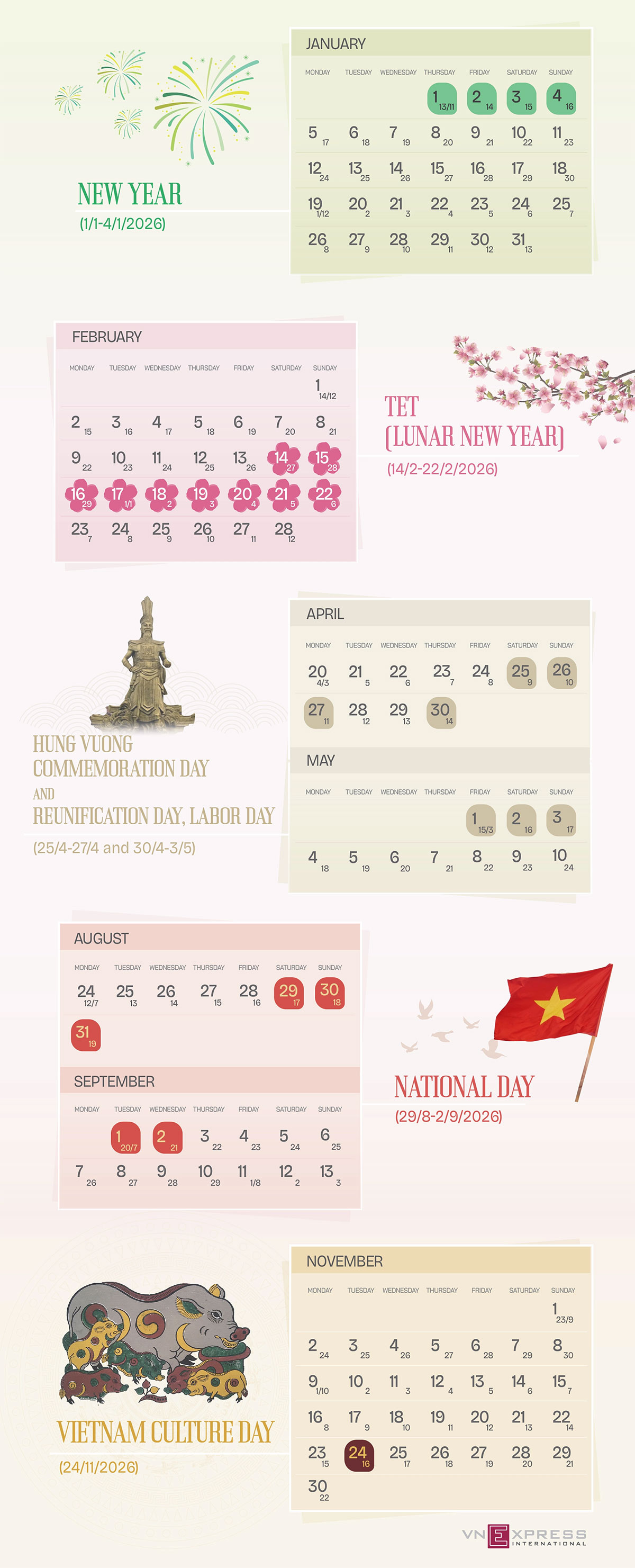 Vietnam's total number of public holiday and Lunar New Year days off in 2026 is set to rise to 26 after November 24 was designated as Vietnam Culture Day, pending formal approval by the National Assembly.