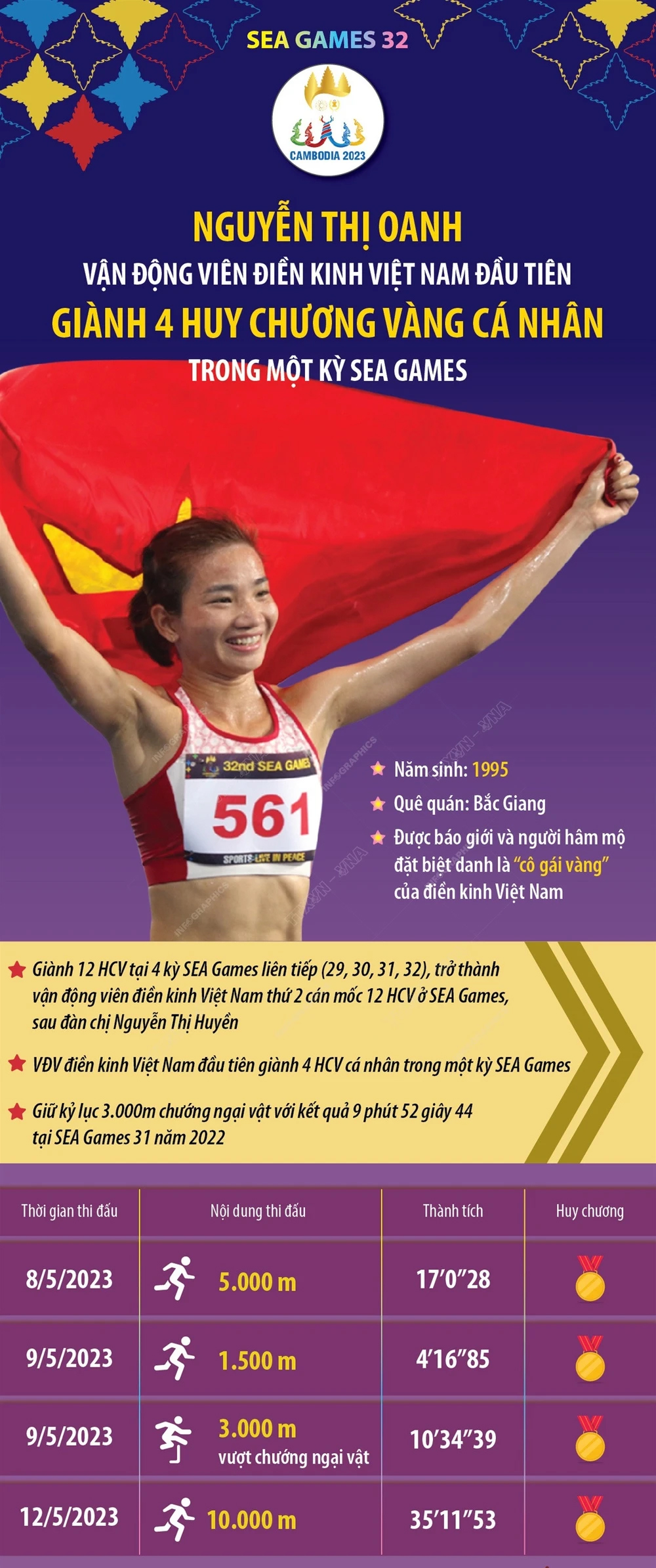 SEA Games 32 tại Campuchia trở thành cột mốc lịch sử của Oanh và của cả thể thao Việt Nam. Chỉ trong hai ngày thi đấu, cô giành 4 Huy chương Vàng ở các nội dung 1500m, 5000m, 10.000m và 3000m vượt chướng ngại vật – kỳ tích mà chưa một vận động viên Đông Nam Á nào từng làm được. "Mỗi lần bước ra đường chạy, tôi chỉ muốn cống hiến hết mình. Đó là cách tôi tri ân tuổi trẻ và những người đã tin tưởng vào mình" – Nguyễn Thị Oanh chia sẻ với báo giới sau chiến tích ấy.