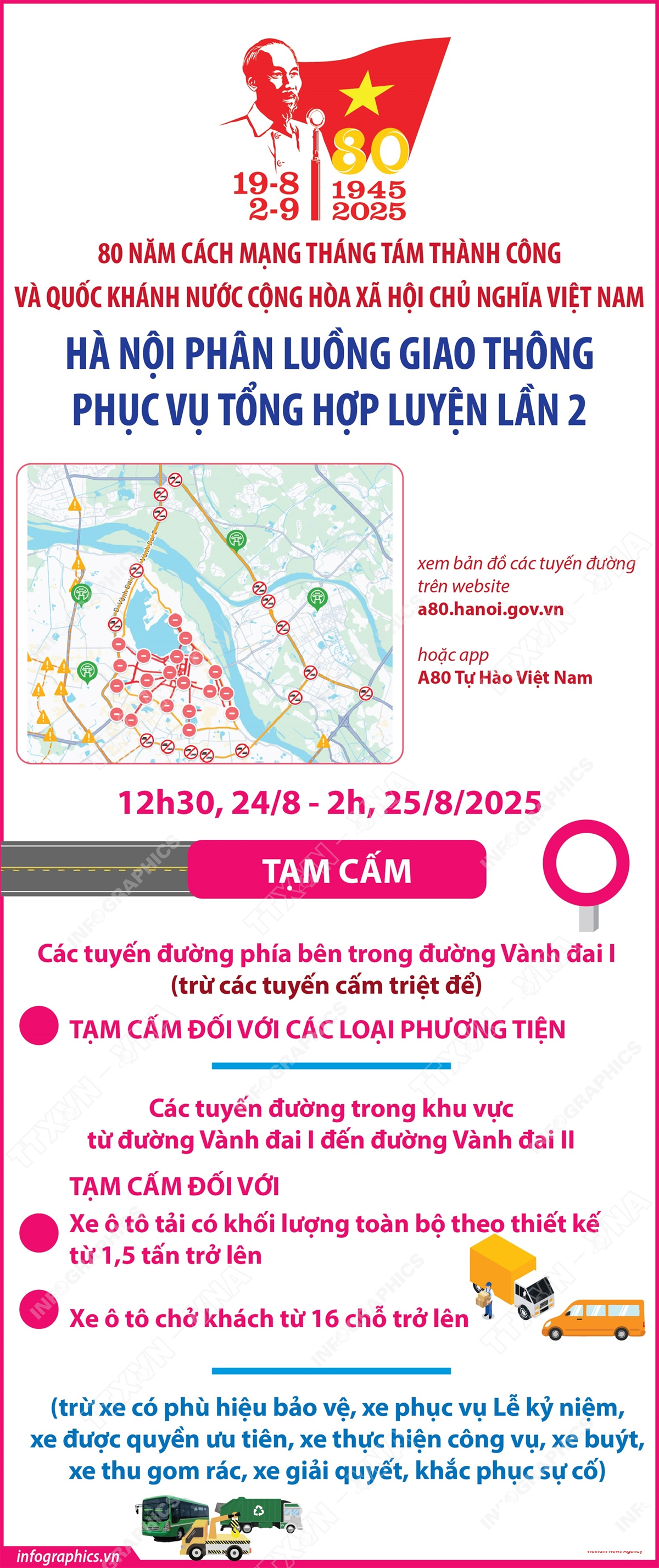 Ngày 24/8/2025, trên địa bàn thành phố Hà Nội diễn ra chương trình Tổng hợp luyện lần 2 Lễ kỷ niệm 80 năm Cách mạng Tháng Tám thành công và Quốc khánh nước Cộng hòa xã hội chủ nghĩa Việt Nam.