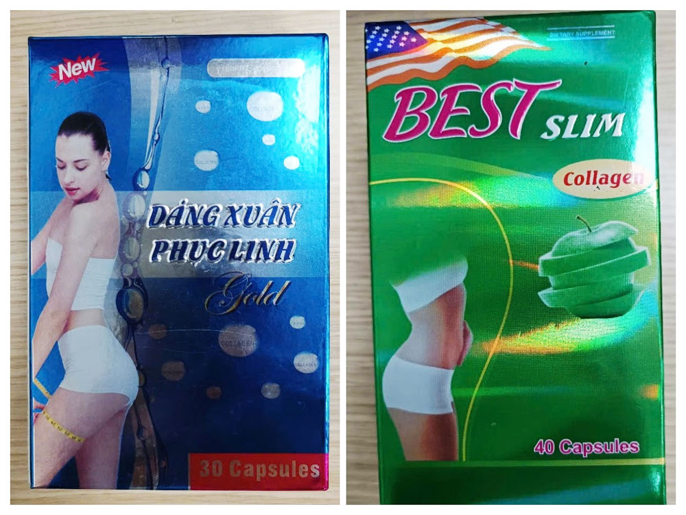 Hai sản phẩm thực phẩm bảo vệ sức khỏe gồm Dáng Xuân Phục Linh Gold và Best Slim Collagen có chứa chất cấm Sibutramine. |