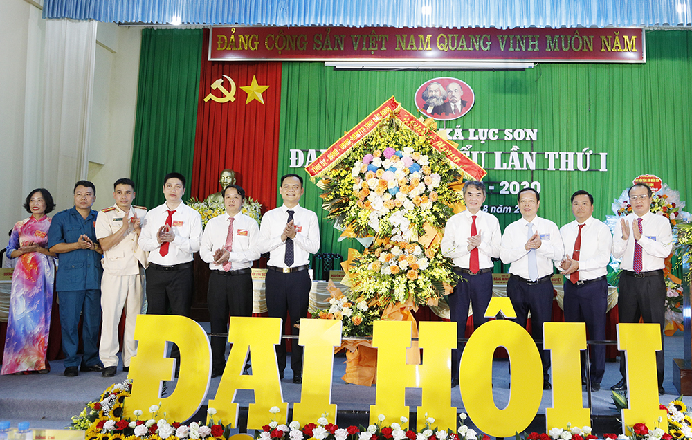 Các đồng chí lãnh đạo tỉnh tặng hoa chúc mừng Ban Chấp hành Đảng bộ xã Lục Sơn nhiệm kỳ 2025-2030. |