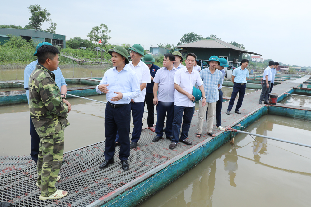 Đồng chí Mai Sơn kiểm tra việc ứng phó với bão lũ tại hộ chăn nuôi thủy sản bằng lồng bè trên sông Đuống, thuộc phường Mão Điền. |