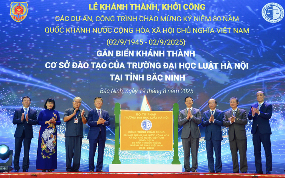 Tại buổi lễ, cùng với các điểm cầu cả nước, Phó Thủ tướng Lê Thành Long và các đại biểu đã thực hiện nghi lễ gắn biển công trình cơ sở đào tạo Trường Đại học Luật Hà Nội tại Bắc Ninh; tặng hoa chúc mừng nhà trường.