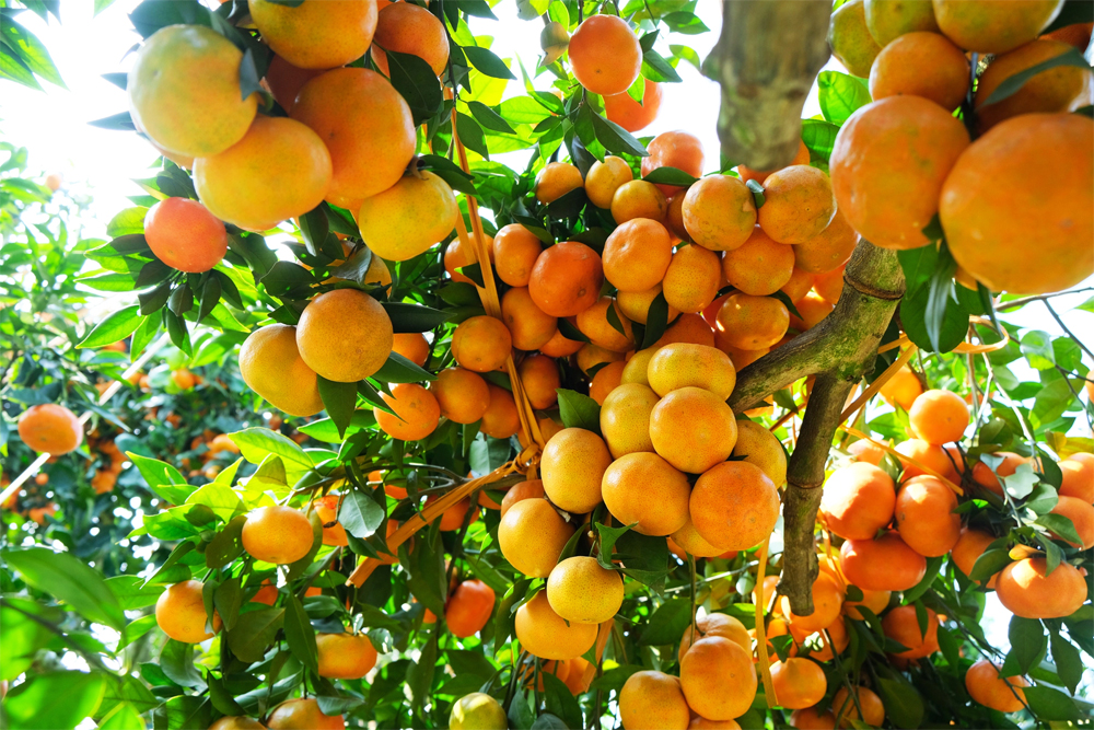 Unlike conventional orange orchards, the grafted oranges grow in dense clusters, each containing 10 to 30 fruits. The clusters hang low to the ground or rest on branches, creating a distinctive visual effect.