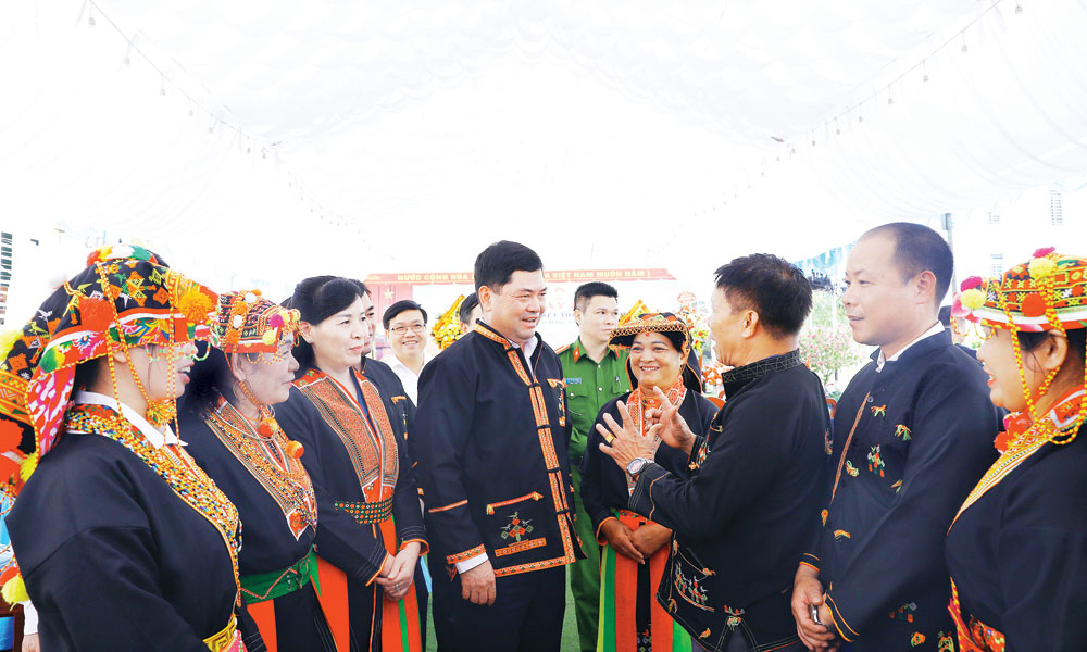 Nguyen Hong Thai, member of the Party Central Committee and Secretary of the Bac Ninh provincial Party Committee, talks with officials and residents of Mau village, Tay Yen Tu commune. |