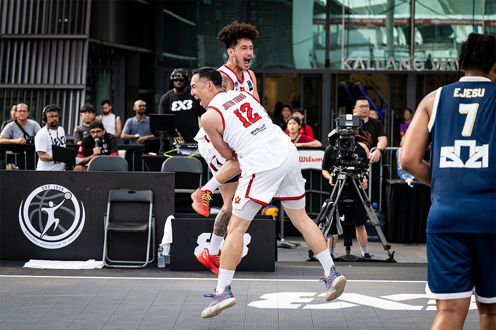 Trần Đăng Khoa và Justin Young (số 12) mừng chiến thắng 21-15 trước Thái Lan ở lượt cuối bảng D vòng sơ loại giải bóng rổ 3x3 châu Á 2025, tại Singapore vào chiều 27/3. |