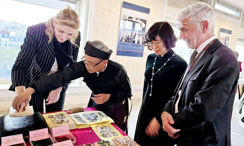 International visitors experience Dong Ho painting printing at UNESCO headquarters in Paris, France. |