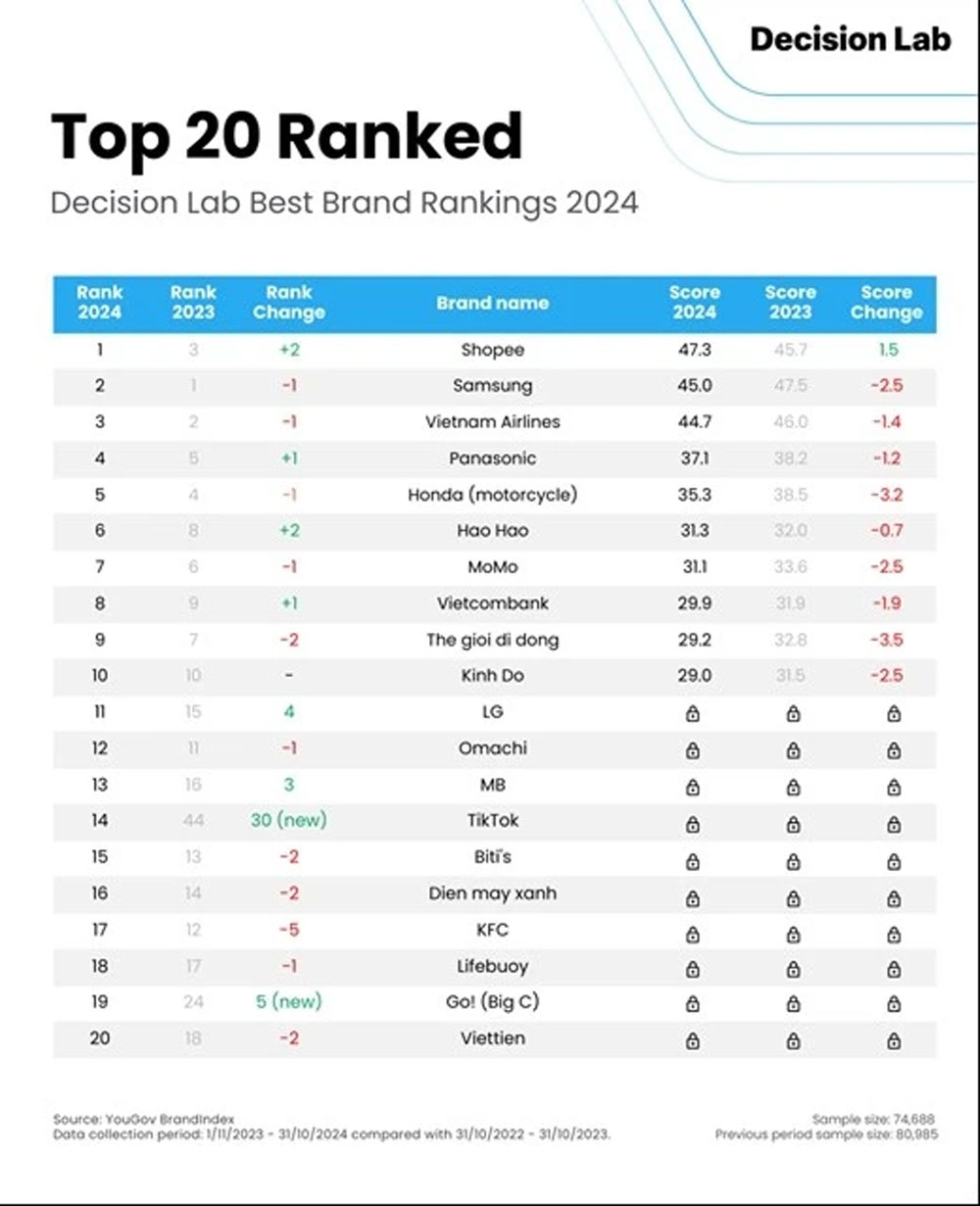 Shopee, Samsung, and Vietnam Airlines continued to secure the top three positions in the Decision Lab Best Brand 2024 Rankings.