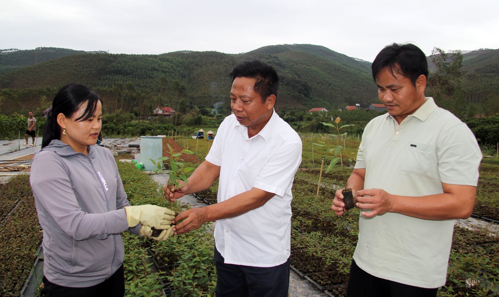 Lãnh đạo UBND xã Vô Tranh thăm vườn ươm giống cây lâm nghiệp của một hộ dân.