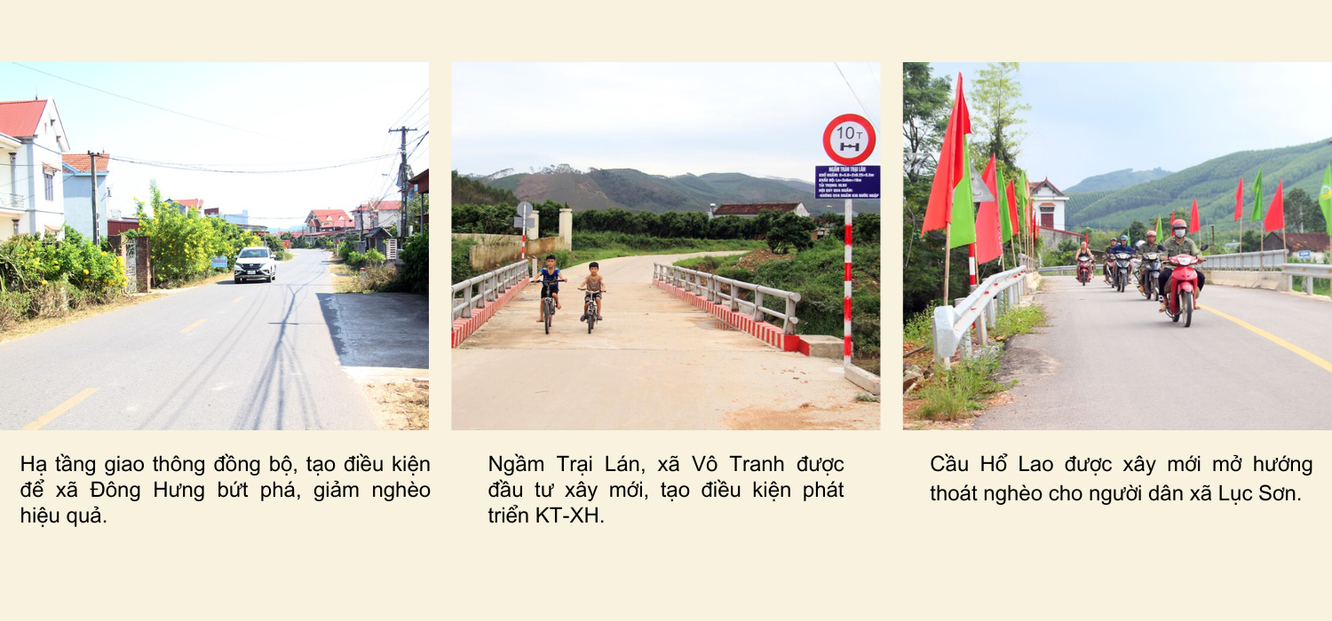Các xã, thị trấn cũng triển khai 22 mô hình phát triển sản xuất nông nghiệp với 238 hộ hưởng lợi, trong đó có 87 hộ nghèo, 98 hộ cận nghèo, 21 hộ mới thoát nghèo trong 36 tháng; tổng kinh phí thực hiện hơn 4 tỷ đồng. Ông Vũ Hoài Sơn, Trưởng Phòng Lao động - Thương binh và Xã hội (LĐTBXH) huyện cho biết: “Thành công lớn nhất của huyện trong công tác giảm nghèo là nâng cao nhận thức, khơi dậy khát vọng vươn lên cho các hộ nghèo. Thông qua hoạt động tuyên truyền, người dân và cộng đồng đã thay đổi nếp nghĩ, cách làm, không trông chờ, ỷ lại vào sự hỗ trợ của Nhà nước”.