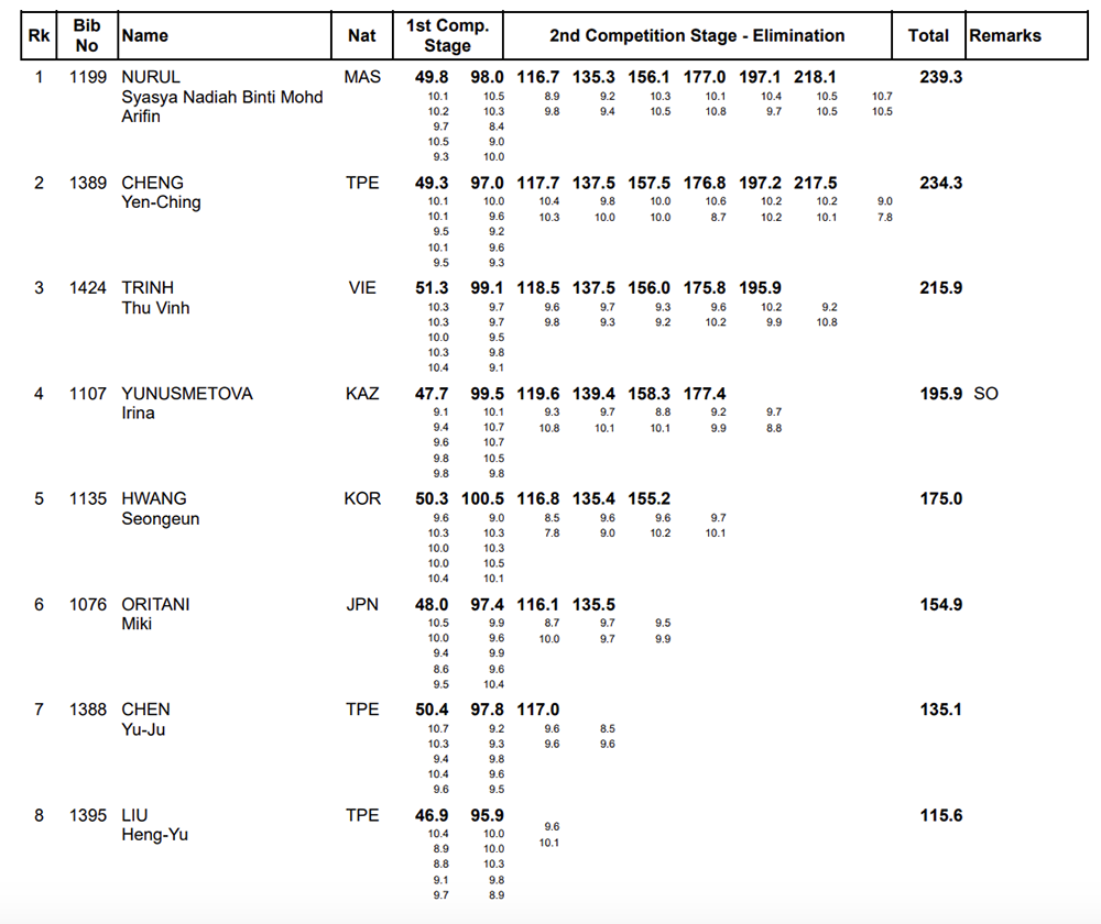 Ở lượt cuối, Nurul vẫn giữ phong độ cao khi đạt 10,7 và 10,5 điểm, trong khi Cheng chỉ 9 và 7,8, để giành HC vàng đầu tiên cho Malaysia tại kỳ giải này.