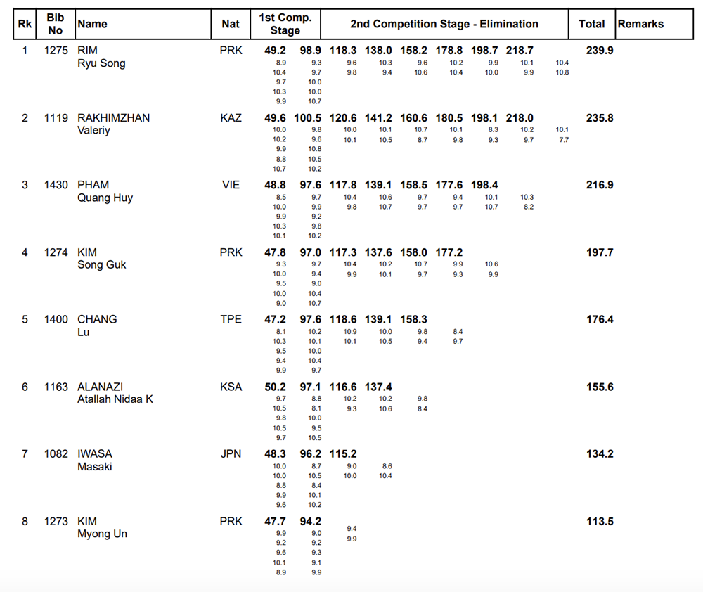 Rakhimzan bước vào lượt quyết định đấu Rim Ryu-song. Anh đạt 10,1 và 7,7 điểm, đành bất lực trước phong độ cao của xạ thủ Triều Tiên khi có 10,4 và 10,8. Rim giành HC vàng thứ ba cho Triều Tiên để củng cố đầu bảng tổng sắp huy chương.