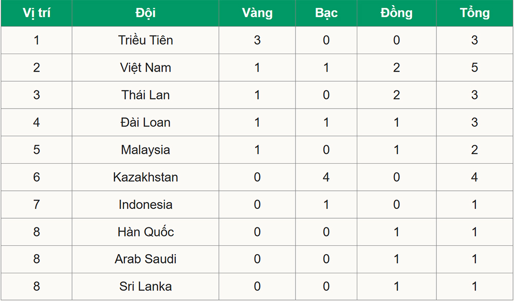 Việt Nam hiện xếp nhì với hai HC đồng vừa đạt được của Thu Vinh và Quang Huy. Hôm qua, bộ đôi nay đã giành HC vàng 10m súng ngắn hơi đồng đội hỗn hợp nam nữ, sau đó Huy cùng Lại Công Minh và Nguyễn Đình Thành giành HC bạc 10m súng ngắn hơi đồng đội nam.