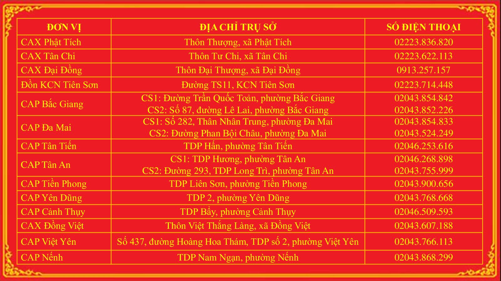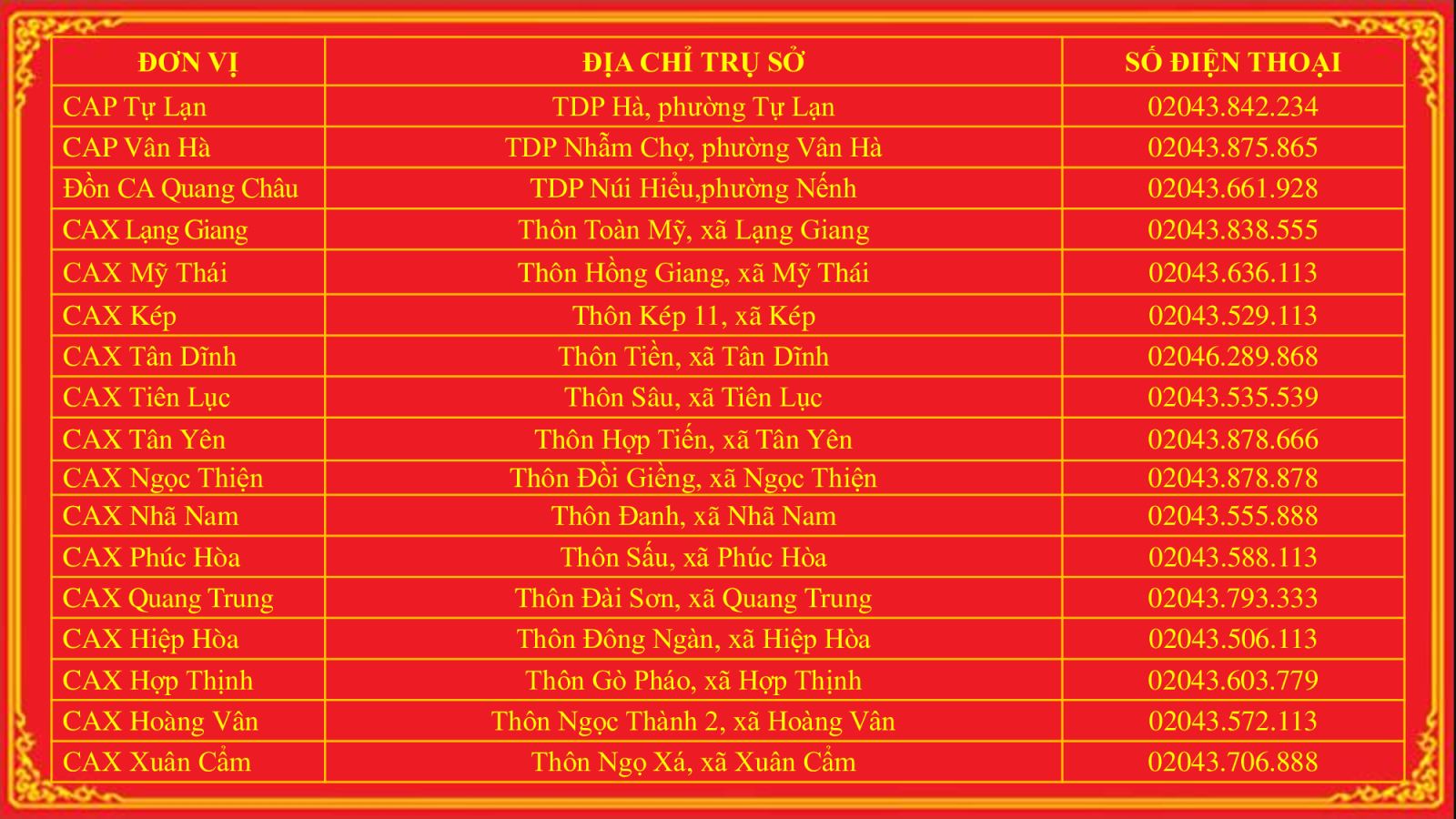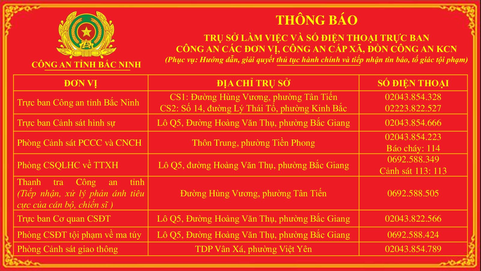 Trụ sở làm việc, điện thoại trực ban công an các đơn vị tỉnh Bắc Ninh
