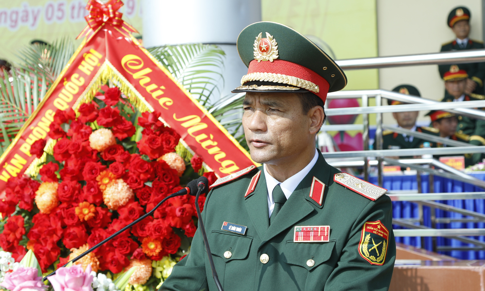 Thay mặt Thường vụ Đảng ủy, Bộ Tư lệnh Quân đoàn 12, Thiếu tướng Lê Xuân Thuân biểu dương những chiến công, thành tích của cán bộ, chiến sĩ Trung đoàn trong suốt 80 năm qua.