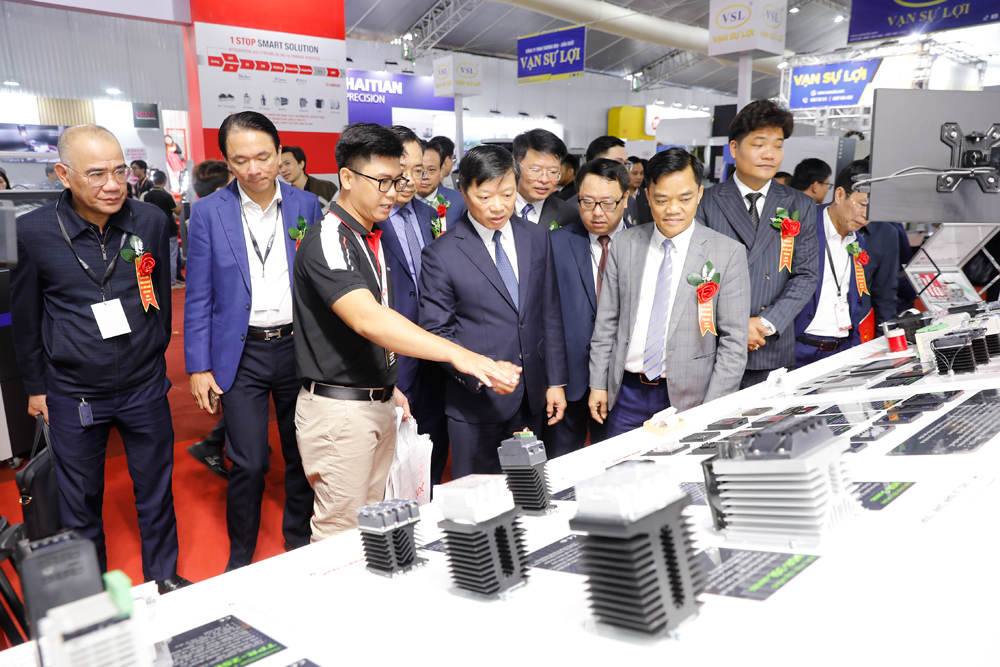 PPC Vice Chairman Dao Quang Khai and delegates visit the booth showcasing industrial products at the event. |