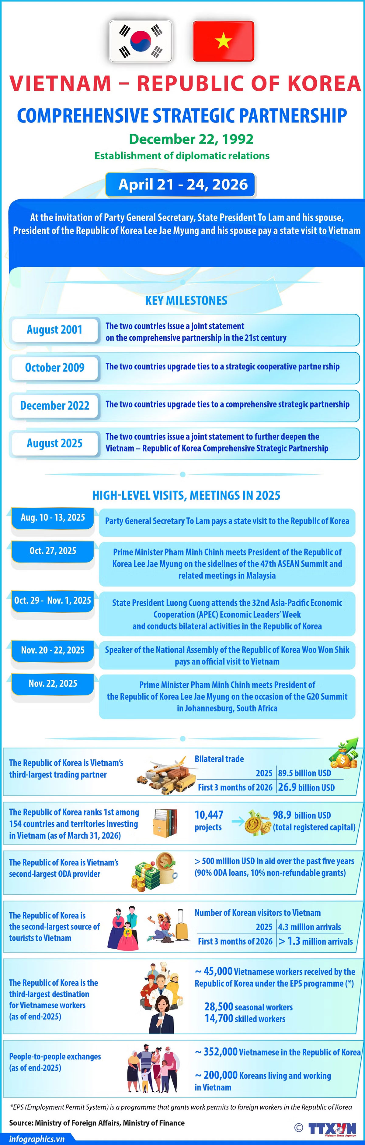 At the invitation of Party General Secretary and State President To Lam and his spouse, President of the Republic of Korea Lee Jae Myung and his spouse pays a State visit to Vietnam from April 21 to 24.
