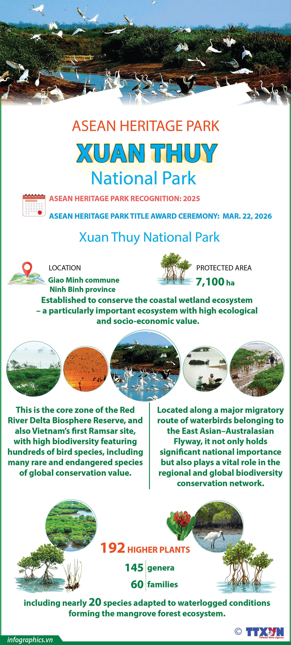 Xuan Thuy National Park in the northern province of Ninh Binh has been recognised as an ASEAN Heritage Park. It is a coastal wetland reserve and Vietnam’s first Ramsar site, known for its rich biodiversity and numerous rare waterbird species. The designation opens up development opportunities while also placing higher demands on conservation and the promotion of its natural values.