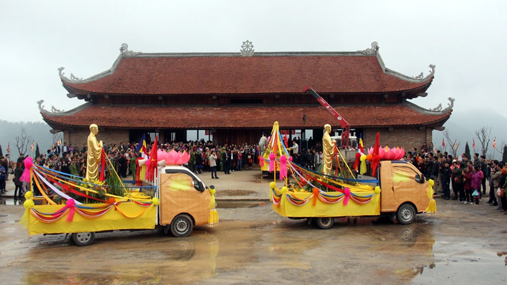 (BGO) – In preparation for the opening of Tay Yen Tu Spring Festival scheduled for February 27 (the 12th day of Lunar New Year 2018), on February 26, Vice Chairman of the Bac Giang provincial People's Committee Le Anh Duong attended and witnessed the procession of the statues of Tam To Truc Lam (the three founders of Truc Lam Zen sect) from Vinh Nghiem pagoda, Yen Dung district to Ha pagoda in Tay Yen Tu spiritual – ecological tourism complex in Tuan Mau commune, Son Dong district.